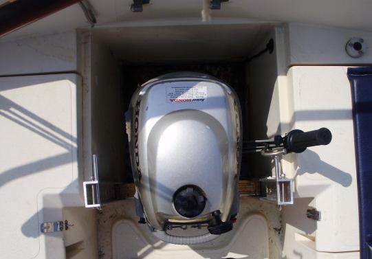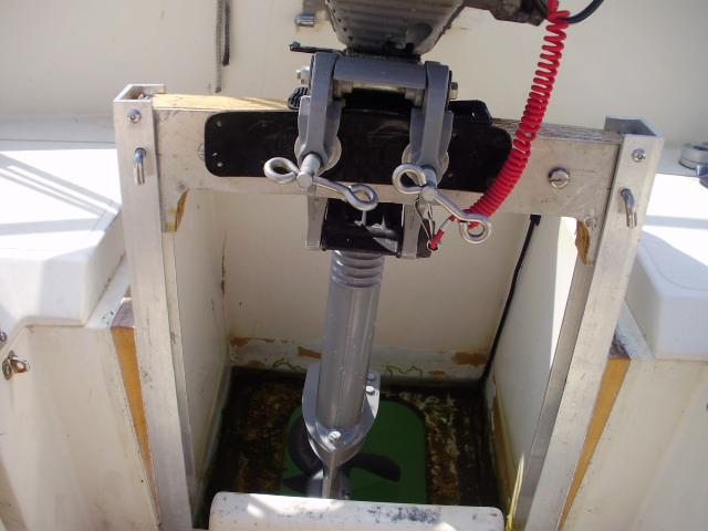 To help with security, the top 'stop pins' are allen screws and locked into place loosely, so they spin if a saw is attempted and the transom wraps around them to prevent cutters. The outboard lock stops one of the retaining pins being removed, so the engine stays captive. Unfortunately couldn't upload 4th picture for some reason, showing the lock.